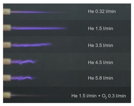 Examples of the discharge images for different gas flow rates are shown in Figure 4. A comparison of the obtained results shows a very strong influence of the flow rate value on the discharge shape, which becomes turbulent for too high flow rates (>3.5 L/min). The highest discharge volume was obtained at a flow rate of 1.5 L/min and this value was chosen as the reference for the following studies. The addition of oxygen admixture to He resulted in a reduction in the length and volume of the discharge, therefore an oxygen addition of 0.3 L/min was selected for further measurements, for which a similar discharge length was still obtained.