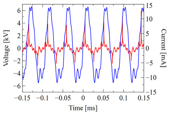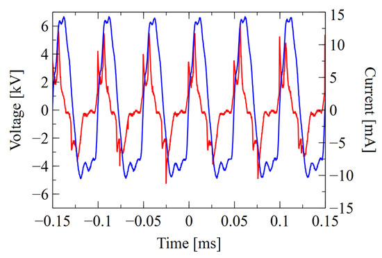Waveform of voltage (blue line) and current (red line) for 1.5 L/min helium.