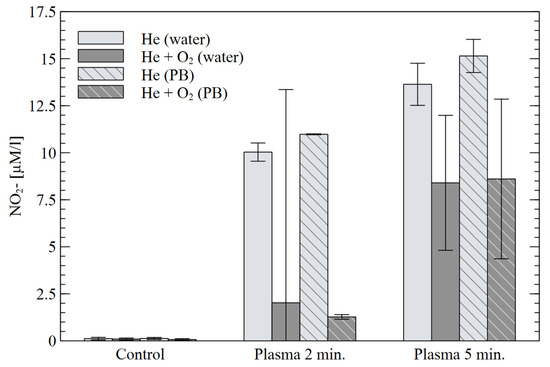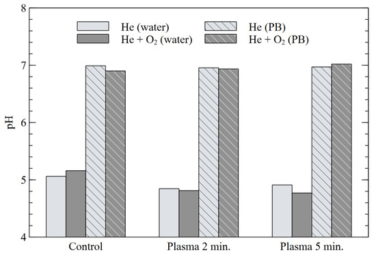 Figure 7 shows pH values of the liquids after the 2 and 5 min treatments. Plasma treatment resulted in a slight decrease of pH value of “water”, which is more noticeable with a mixture of He+O2. For the “PB” solution, no significant difference in pH was observed even after 5 min of treatment. These values are consistent with our formerly-obtained results [7,38,39,52]. Gaseous nitrogen oxides NOx were generated in plasma jet surrounded by ambient air and further transported to the liquid phase, where nitrate NO3− and nitrite NO2− anions accompanied with hydronium ions H3O+ were formed. Consequently, reaction of NO2− with H3O+ ions resulted in an acidic product: nitrous acid HNO2, which caused a slight pH decrease of “water”. The aim of the phosphate buffer (PB) solution was to investigate the pH impact on the other parameters of plasma-treated liquids. Presented results confirm that phosphate buffer was not affected by plasma.