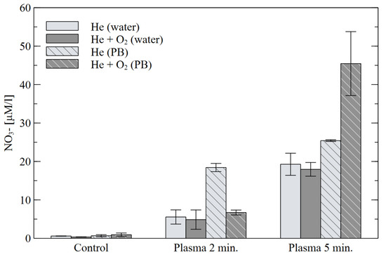 The concentration of nitrates NO3− for the 2- and 5-min plasma treatments is shown in Figure 10. For both working gases, the concentration of NO3- is higher for the “PB” liquid, while for the mixture of He+O2 the difference is more than double. In this case, the addition of oxygen caused a much greater amount of NO3− compared to He alone.