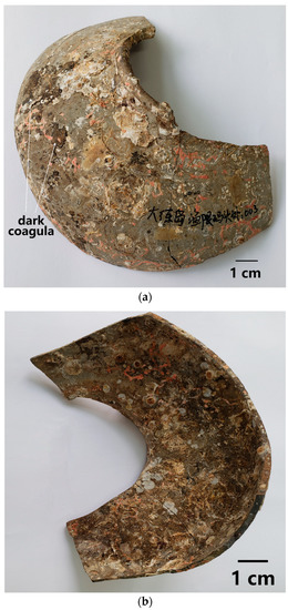 Appearance of the sauce-glazed shard DL of the Song Dynasty salvaged out of water at the Dalian Island Wharf: (a) outer surface, showing serious glaze spalling, dark coagula, and various marine animal remains; (b) inner surface, showing contamination and various marine animal remains. Chinese in (a): out of the Dalian Island Yuxian Wharf: 003.