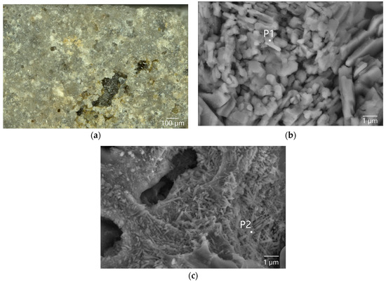 The OM observation (Figure 2a) showed that the glaze on the outer surface of sample DL-1 was rough and contained a lot of microcracks. The SEM observation and micro-area EDS analysis of sample DL-1’s surface (Table 2) confirmed that the body/glaze interlayer exposed at the breakage position of the glaze was composed of rod-like anorthite crystals (Figure 2b and P1 in Table 2). The sill-like crystal clusters composed of needle-like mullite crystals were found in the naked body, which were transformed from the clay minerals in the body at approximately 1000 °C (Figure 2c and P2 in Table 2) [20].