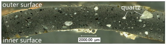 The OM image of the cross-section of sample DL-2 showed that the body was featured by a lot of pores. A large number of quartz particles of different sizes, with a maximum diameter of up to approximately 0.2 mm, were found in the body, as shown in Figure 3. It could be inferred that the quartz particles were intentionally added for enhancing the resistance to thermal distortion [20]. During the mixing of raw materials, the quartz particles of different sizes were wrapped with iron-bearing clay. In the following firing and cooling process, the quartz underwent an α–β phase change at 573 °C twice [4]. The cracks then appeared because of repeated volume expansion and shrinkage.