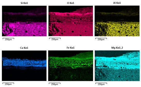 The outermost layer, that is, the D-layer coagula, with a thickness of 20–50 µm, was mainly composed of Si, Al, Fe and Mg, without Ca (the single-element mapping in Figure 9). This was attributed to the deposition of some foreign pollutants such as iron rusts, sea sands, and sea mud.