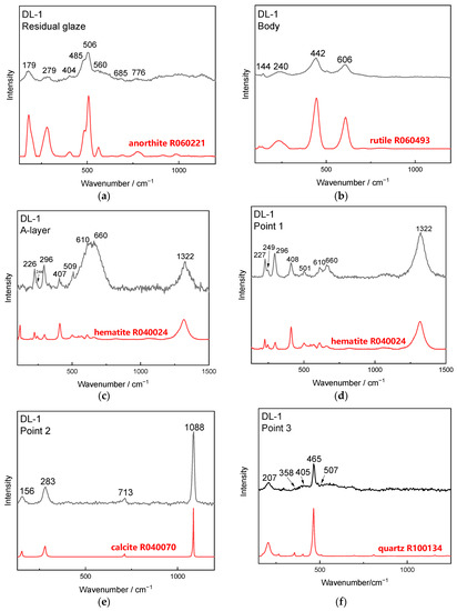 Characteristic positions of sample DL-1 were analyzed using μ-Raman, on the cross-sections of the residual glaze, body and interlayer coagula (A-layer coagula), and on the natural surface of the cellular coagula (Point 1–3), as shown in Figure 12. Several phases, including anorthite (from the residual glaze), rutile (from the body), hematite (from A-layer and Point 1), calcite (from Point 2), and quartz (from Point 3), were identified. Calcite and hematite were located in the yellow-white region and the brick-red region of the cellular coagula surface, respectively.