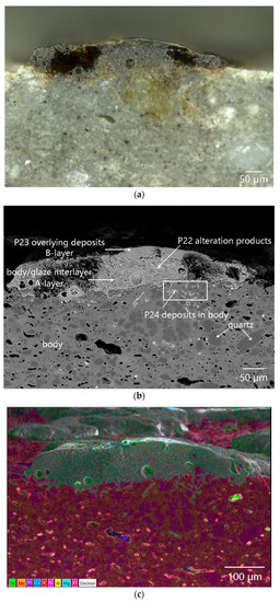 The residual glaze was observed on the outer surface of sample DL-1. The cross-section was then examined using OM and SEM-EDS analysis (Figure 14, Figure 15). As shown in Figure 14a, the residual glaze was rough and uneven. Some dark foreign pollutants below the glaze layer had already entered the body, with a maximum penetration depth of 180 µm. Figure 14b showed that cracks existed at the interface between the residual glaze and the body. Contrary to the residual glaze below the coralline algae (Figure 8b), the glaze-body bonding had already become quite loose, and the glass phase of the glaze showed significant changes. The glaze at the surrounding position had already been completely peeled off with the exposed body.