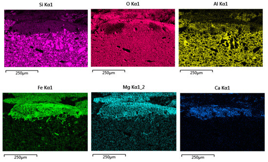 Cross-sectional morphology and element mapping images showed that the body/glaze interlayer, including a lot of anorthite crystals (A-layer in Figure 14b), with a thickness of approximately 80–90 µm, could be clearly observed. The glass phase around the crystals is rich in Fe, Si and O, and a small amount of Mg and Al (A-layer in Figure 14b, P22 in Table 4), which is quite different from the chemical composition of the glass phase originally wrapping the anorthite crystals. The B-layer above the interlayer (Figure 14b), with a thickness of approximately 25–30 µm, was similar to that filled among crystals in chemical composition (P23 in Table 4). However, the B-layer contained more Mg and less Al. The box in Figure 14b also showed that the cracks in the body were filled with substances with low contrast. The EDS data (P24 in Table 4) indicated the similarity with P22 (in Table 4) in chemical composition and a higher content of Fe.