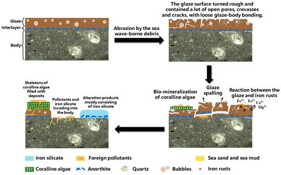 Based on the above discussion, the degradation process of DL was plotted, as shown in Figure 16. Firstly, pores and cracks were formed on the glaze surface after abrasion by the sea wave-borne debris, leading to the poor preservation state of the ware. Coralline algae were tightly attached to the rough glaze surface. The calcareous skeleton with micron-sized pore channels was filled with foreign pollutants such as iron rusts, sea sands, and sea mud, preventing further damage to the residual glaze. The spalling of the glaze resulted in the exposure of body, and foreign pollutants deposited on the body surface. Meanwhile, iron rusts also reacted with the glaze and caused the chemical alteration. Anorthite crystals in the body/glaze interlayer did not participate in the reaction but remained at the original position. The alteration products, mostly consisting of iron silicate, gradually replaced the original glass phase and invaded into the body via pores and cracks.