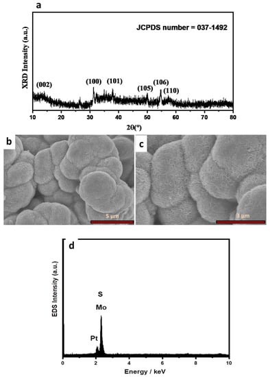 (a) PXRD and SEM images (b,c) and EDX spectrum (d) of the prepared MoS2.
