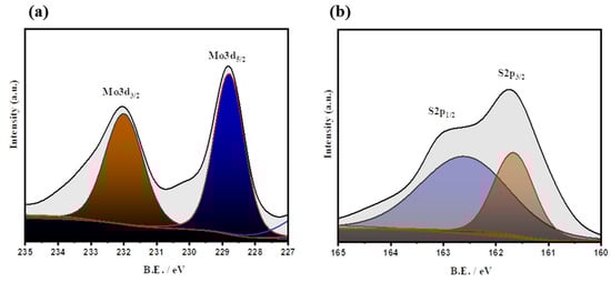 XPS studies were also performed to further characterize the oxidation states of the elements present in the prepared MoS2. The Mo3d spectrum of MoS2 has been presented in Figure 2a. The Mo3d spectrum of MoS2 demonstrated two binding energy of 231.99 and 228.7 eV which may be ascribed to the presence of Mo3d3/2 and Mo3d5/2, respectively (Figure 2a) [32]. On other side, the S2p spectrum of MoS2 is shown in Figure 2b. Two binding energy of 162.62 and 161.66 eV were observed which can be assigned to the S2p1/2 and S2p3/2, respectively (Figure 2b) [32].