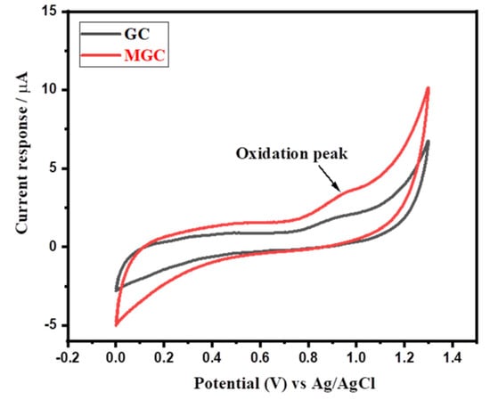 CV response of the GC and MGC for 50 µM RS at a scan rate of 50 mV/s.