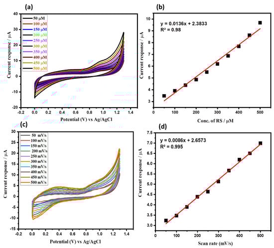 (a) CV responses and calibration plot (b) of the MGC for 50–500 µM RS at a scan rate of 50 mV/s. (c) CV responses and calibration plot (d) of the MGC for 50 µM RS at a scan rate of 50–500 mV/s.