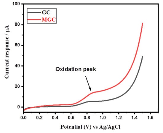 LSV responses of the GC and MGC for 50 µM RS at a scan rate of 50 mV/s.