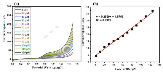 LSV responses (a) and calibration plot (b) of the MGC for 2–125 µM RS at a scan rate of 50 mV/s.