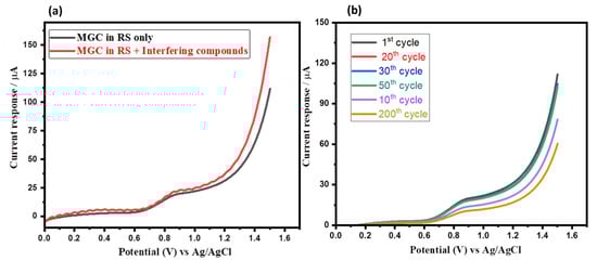 The LSV response of the MGC was obtained for 50 µM RS at a scan rate of 50 mV/s. The obtained LSV response of the MGC for 50 µM is presented in Figure 7a. Further, the LSV response of the MGC for 50 µM RS + 250 µM interfering compounds (nitrophenol, glucose, urea, uric acid, catechol, hydrazine, hydrogen peroxide, ascorbic acid, and dopamine) was also recorded. The observations did not show any significant variation in the electro-catalytic current response. Therefore, it revealed the presence of a good anti-interfering nature of the MGC for RS determination. In previous years, various electrochemical sensors have been reported which studied the cyclic stability and repeatability. In our present work, we have also studied the cyclic stability and repeatability of the MGC for 50 µM RS at a scan rate of 50 mV/s.