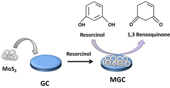 The LSV responses of the MGC for 50 µM RS were recorded up to 50 cycles. The LSV response for the 1st, 20th, 30th, 50th, 100th and 200th cycle of the MGC are shown in Figure 7b. The obtained LSV responses show good cyclic stability and cyclic repeatability after 50 cycles. However, the MGC also retained more than 50% stability after 200 cycles. This stability may be attributed to the excellent 2D-layered structure of MoS2. The electro-oxidation process for RS sensing is described in Scheme 1. During the electrochemical-sensing process, 1, 3 benzoquinone formed in the electro-oxidation of RS, as shown in Scheme 1.