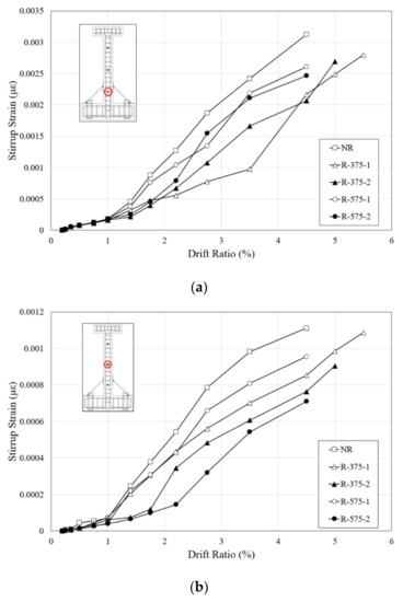 Since the experiments on all the specimens were terminated as a result of shear failure, strain on the stirrups showed the shear force applied to the RC columns. Figure 13 shows the stirrup strain-drift ratio relationships of the specimens, and they are divided by the height strain gauges that were attached as aforementioned. With the development of diagonal cracks in the columns, the strain on the stirrups increased. The strain on the stirrup of the NR specimen increased rapidly with the process of loading after the shear cracks occurred, and the stirrup at the bottom of the column yielded before the maximum load. The increase in strain continued as the load was applied. However, the strains on the stirrups of the retrofitted specimens were much smaller than in the NR specimen, which indicates that retrofitting with the RSL system provided strong resistance to lateral load. As the drift ratios of the initial occurrence of the shear cracks and the maximum loads of all the specimens were different, there were various sections with dramatic increases in the stirrup strain. As stress was concentrated in the plastic hinge region of the columns, the lowest stirrups had the greatest strain, the middle stirrups had less, and the lowest strain was measured at the highest stirrup. In the NR specimen, the strain in the stirrups at bottom and central parts of the column increased with the expansion of the width of the shear cracks. On the other hand, the stirrups of the R-375 and R-575 specimens had lower strain than the NR specimen. This means that the RSL system more effectively suppressed the expansion of the cracks developed in shear failure surfaces.