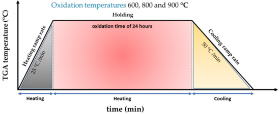 Cylindrical samples of 10 mm diameter × 2 mm height were prepared according to ASTM E3-11 [42] from the as-built bar, and were ground using a 1200 grade SiC sandpaper, followed by an ultrasonic cleaning in ethanol, and then dried in air for 12 h. The grinding process was carried out to eliminate the residual superficial stress generated by EBM and the possible effect of surface roughness on oxidation behavior. A thermogravimetric analyzer (TA Instruments, New Castle, DE, USA) model TGA550 and manufactured by TA instruments, was employed to study in situ oxidation kinetics. The accuracy of the balance was 0.001 g. The samples were heated in high purity (99.9%) oxygen gas environment using a flow of 40 mL/min, at temperatures of 600, 800 and 900 °C, respectively. The heating rate was 25 °C/min with an oxidation time of 24 h (see Figure 1). The weight change was monitored over the entire exposure period with measurements conducted every second.