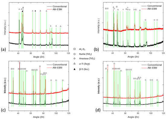 As the oxidation temperature increased from 800 to 900 °C, the corresponding peaks of the Anastasa lattice disappeared, being transformed to Rutilo (reference pattern 98-002-2025, EBM and 98-006-2534, conventional samples), and along with Al2O3 (reference pattern 01-071-1683 to EBM and conventional samples) peaks become more defined. The intensity and position of the peaks are the same for both temperatures (see Figure 3c,d). This may be explained by the thermodynamics, since temperatures higher than 700 °C can be more favorable for the formation of Al2O3. Peaks corresponding to the base material (i.e., HCP or BCC) were not observed in this XRD pattern and this could be attributed to the X-ray not able to penetrate the OL and detect the base material [47]. Here the diffusion of aluminum toward OL on the surface reduced the amount of dissolved oxygen available to react with titanium [48,49,50,51]. Thus, at temperatures of 800 and 900 °C, the oxidized surface consisted mainly of rutile-type TiO2 and Al2O3.