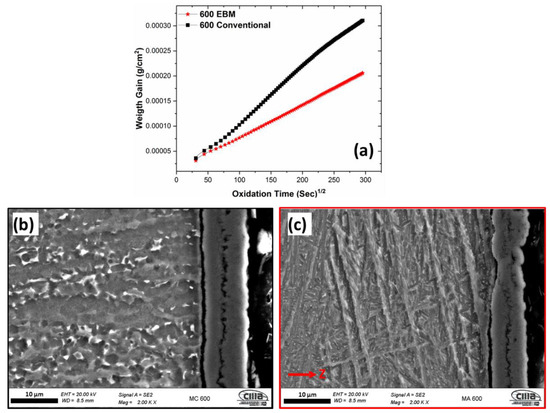 (a) Oxidation kinetics curves of Ti-6Al-4V alloys manufactured via EBM and conventionally; FESEM-SE morphology of the oxide layer formed at 600 °C for 24 h of (b) conventional and (c) EBM (red arrow indicates the building direction).