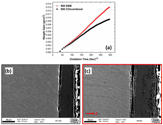 (a) Oxidation kinetics curves of Ti-6Al-4V alloys manufactured via EBM and conventionally; FESEM-SE morphology of the oxide layer formed at 900 °C for 24 h of (b) conventional and (c) EBM (red arrow indicates the building direction).