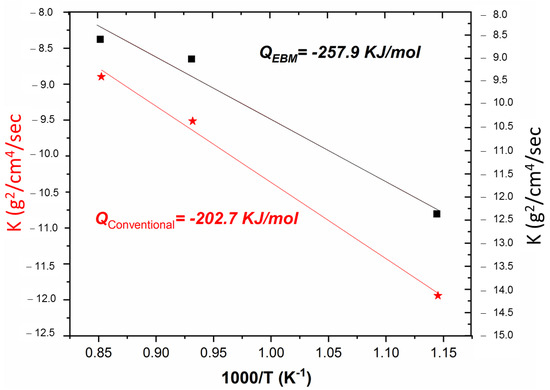 The linear fit between (k) and (1/T) curve for oxidation at various temperatures (show in Figure 7). The calculated values of the activation energy Q were 202.7 KJ/mol for titanium samples by conventional manufacturing and 257.9 KJ/mol for titanium samples by the EBM process, respectively.