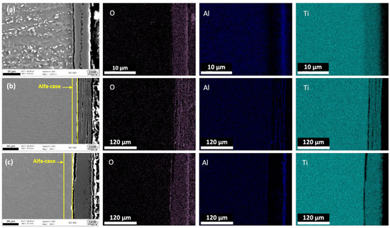 Cross section of the EBM Ti-6Al-4V alloy oxidized at (a) 600 °C, (b) 800 °C and (c) 900 °C after 24 h; mapping of elements by FESEM identifying the formation of oxide layers.