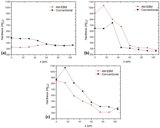 Hardness values were observed to gradually decrease from the surface, on the OL to base material. Samples oxidized at 600 °C during 24 h presented hardness values in the range of 350 to 470 HV and 320 to 390 HV for the conventional and EBM samples, respectively. These hardness ranges are comparable to those reported elsewhere [54]. The differences observed could be related to the different microstructures presented by conventional and EBM samples in the unoxidized state (Figure 2) due to the low effect of the temperature (600 °C) on the microstructure.