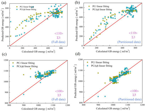 For comparison, Figure 2 exemplifies energy predictions of Σ3 and Σ5 asymmetric copper GBs related to <110> and <100> tilt axes. In order to assess the prediction improvement due to the data partition, MAEs of all predictions are calculated, as shown in Figure 2. For Σ3 GBs, MAEs for PCi- and PCi(ϕ)-based linear fittings using full data are 64.57 mJ/m2 and 113.77 mJ/m2, but those for partitioned data are 45.49 mJ/m2 and 87.42 mJ/m2. For Σ5 GBs, MAEs for PCi- and PCi(ϕ)-based linear fittings using full data are 25.58 mJ/m2 and 29.62 mJ/m2, but those for partitioned data are 4.29 mJ/m2 and 10.66 mJ/m2. From further inspection of the variation of MAEs due to the data partition, MAEs for PCi- and PCi(ϕ)-based linear fittings are reduced by ~30% and ~23%, respectively, but, for Σ3 GBs, they are up to ~83% and ~64%. This suggests that a better prediction can be achieved by separately considering <110> and <100> GB datasets, which is particularly more prominent for <100> GBs. From the MAEs results of PCi and PCi(ϕ) linear fittings for Σ3 and Σ5 GBs, PCi(ϕ) linear fittings indeed lead to a larger MAE than PCi linear fittings, which is understandable since PCi(ϕ) is approximately obtained from cubic interpolation. Nevertheless, these results show that PCi is capable of being correlated with inclination angle ϕ.