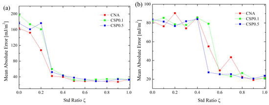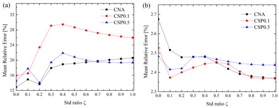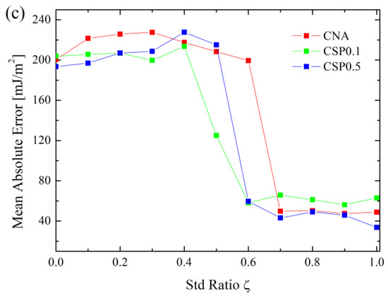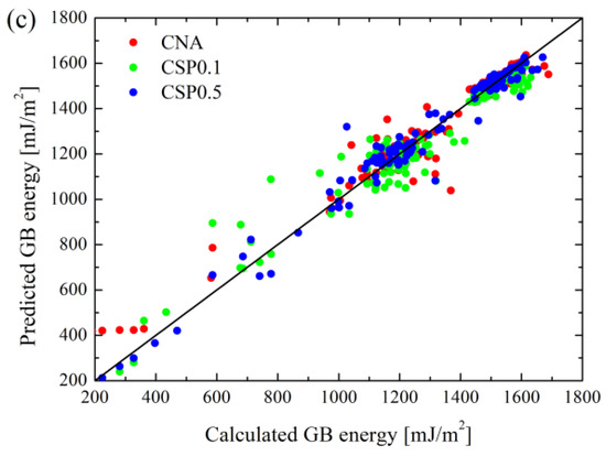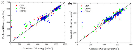 In order to compare the effects of the GB atom selection method (i.e., CNA, CSP = 0.1 and CSP = 0.5) on the prediction, Figure 3a,b exemplify the MRE of <110> and <100> Cu GBs vs. . From Figure 3, with increasing , the MRE of <110> GBs keep increasing; however, that of <110> GBs keep decreasing. Finally, MREs of both <110> and <100> GBs reach plateaus. Further inspection of Figure 3 reveals that the minimum values of MRE for <110> and <100> GBs for CAN and CSP0.1 methods correspond to = 0.0 and 1.0, respectively. For the CSP0.5 method, the minimum values of MRE for <110> and <100> GBs are = 0.2 and 0.1. Moreover, considering CAN, CSP0.1 and CSP0.5 alone, MREs also differ at = 0.0, but their general variation trends are similar. Therefore, it can be seen that a better prediction not only requires an appropriate GB atom selection method, but an appropriate value of . In fact, the MREs of Al and Ni are also dependent on , as seen from Figures S15 and S20 in Supplementary Material.