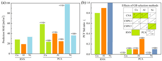 For the three metals, the lowest MAE can be obtained when is greater than 0.8 for RNN, while that should be smaller than 0.3 for PCA-based linear regression. This indicates the dependence of GB descriptors on the ML method. Meanwhile, PCF as an average function and GB structure descriptor needs to consider the PCFstd, by which ML prediction accuracy can be improved. The GB structure descriptor in the form of average structure representation (ASR) may need to further take into account the standard deviation of ASR.