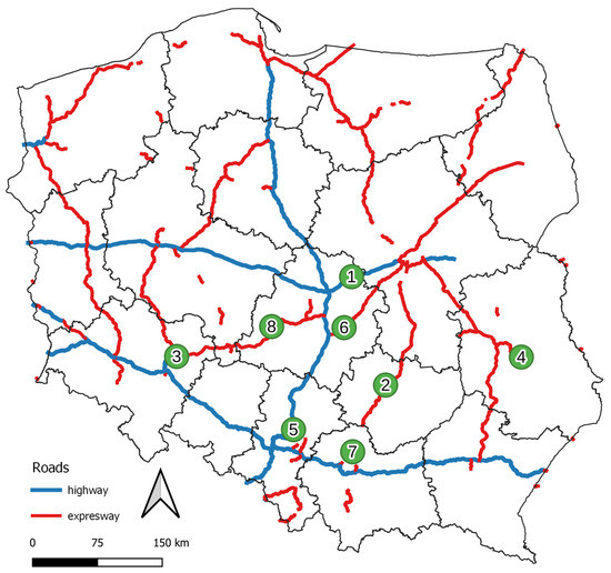 Road dust samples were selected for road sections meeting the highest technical and operational requirements, i.e., highways and expressways located in the central and southern parts of Poland. Roads with two types of the surface were selected (asphalt and concrete). The list of roads is provided in Table 1. The locations of measurement points on the map are shown in Figure 1.