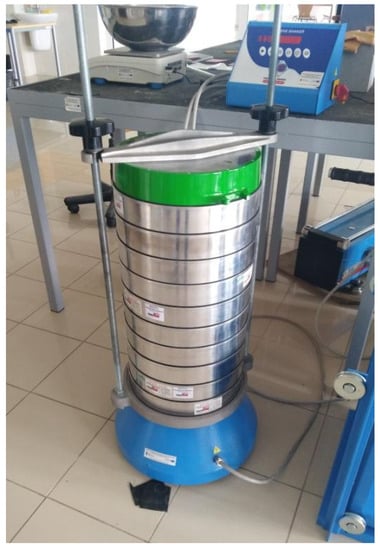 The study of the granulometric composition of the material was carried out in the laboratory of the National Academy of Applied Sciences in Chełm on a Sieve Shaker mechanical sieve shaker (Figure 3); RADWAG laboratory balance was also used. Using a standard type of sieves, seven material fractions were obtained: 10–2 mm, 2–1 mm, 1–0.5 mm, 0.5–0.25 mm, 0.25–0.1 mm, 0.1–0.063 mm and <0.063 mm.