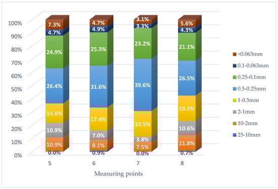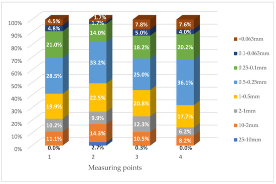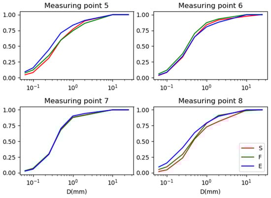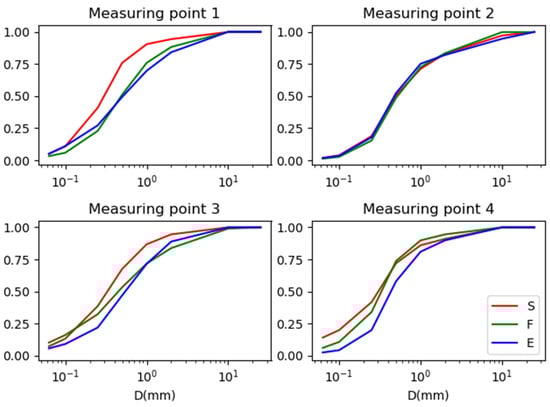 The granulometric composition of the dust collected at each measurement point is presented in the form of grain size curves [30] and summarized for three control points (S, F and E) in Figure 10, Figure 11 and Figure 12.