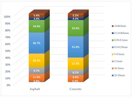 Comparing the mass fraction of particles <0.1 mm of material collected from two types of pavement (Figure 6), it was found that the obtained results are very similar. The share of PM in the mass of road dust is slightly higher for the concrete pavement (9.5%), while for the asphalt pavement, the value was 9.3%. Based on the obtained results, it should be concluded that the share of PM in the mass of road dust is not affected by the type of road surface. Particles generated from the abrasion of both asphalt and concrete roads are larger than the analyzed fraction <0.1 mm [22].