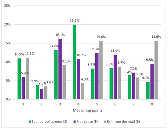 For the area covered with sound-absorbing screens (S). the share of PM in the road dust mass was from 3.9% in point 2 (S7 Kielce bypass) to 19.9% in point 4 (E8 Lublin–Piaski expressway). In the case of the checkpoint where there were no terrain barriers in the vicinity of roads (F), the results oscillated between 2.8% in point 2 (S7 Kielce bypass) to 16.1% in point 3 (E8 Wrocław–Sieradz expressway). On the other hand, at the third control point (E), the share of PM in the road dust mass was from 3.6% in point 2 (S7 Kielce ring road) to 15.6% in point 5 (A1 Częstochowa–Katowice highway) and 8 (S8 Sieradz expressway–Wroclaw). It follows that the largest mass share of the finest particles of road dust occurs in the space covered with a terrain barrier, which is consistent with the results of previous research [34]. It has been proven that noise barriers adjacent to the roadway can inhibit the movement of air off the road, leading to increased concentrations of pollutants on the roads and thus blocking the effective dispersion of the finest particles [35,36]. However, in the case of control points F and E, the maximum values of the share of PM in the mass of road dust are similar and oscillate around 16%. Comparing the measurement points (F-E), a higher share of PM in the mass of road dust was obtained in four points for area F (E8 Wrocław–Sieradz E8 Lublin–Piaski, S8 Warszawa–Piotrków Trybunalski, S7 Kraków–Widoma) and four for area E (A2 Warszawa–Łódź, S7 ring road of Kielce, A1 Częstochowa–Katowice, S8 Sieradz–Wrocław). The vicinity of the control points does not affect the fraction <0.1 mm in the mass of road dust.