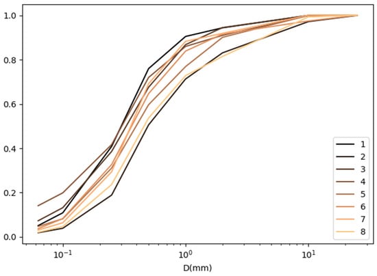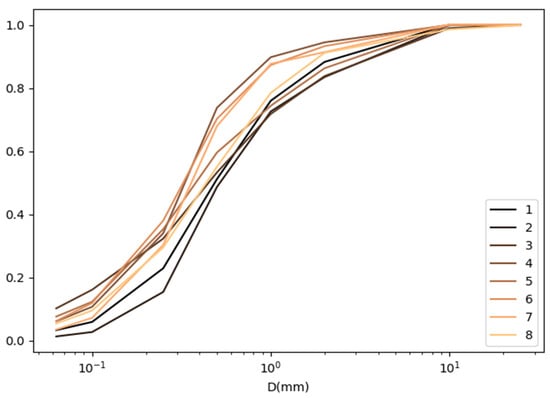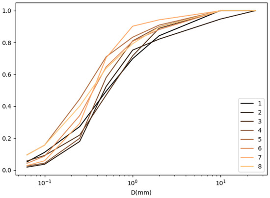 Grain size curves are, in fact, empirical distributions of particle mass distribution. To answer the question of whether there are statistically significant differences between the two grain-size curves, the non-parametric Cramér–von Mises test was used [31,32]. Using this test, at each sampling point (measuring points 1–8), the grain size curves at the control points (S, F and E) were compared in pairs. The tests were carried out using the scipy package of the Python programming language [33].