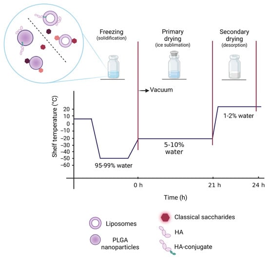 Freeze drying, also named lyophilization, is the most used method to remove water and handle the long-lasting stability of nanoparticle formulations [9,10]. As an example, over the last two years of the COVID-19 pandemic, the urgent need to achieve a dry form of nanoparticle-based therapeutics highlighted the importance of lyophilization studies to improve the storage stability of lipid nanoparticle vaccines [11,12]. Freeze drying removes water from a frozen sample by sublimation and desorption under a vacuum in three main steps: freezing, primary drying and secondary drying (Figure 1). The first freezing phase is the key step known to generate a variety of stresses, which have a significant impact on nanoparticle stability concerning aggregation and formation of macroscopic particles [13,14,15]. Furthermore, the freeze-drying procedure may alter drug content, particle size distribution and production of a workable cake with a short reconstitution time [16,17]. For these reasons, to protect the formulations from possible alterations induced by the dehydration process, it is advisable to add some excipients that act as protectants during freeze drying [18]. The excipients routinely employed include cryo- and/or lyoprotectants that are chemically innocuous and protect the nanoparticles during the freezing or drying stage of the process, respectively. The addition of protective excipients should depend on the nature of nanoparticles and the different components added during the formulation. For instance, as cited before, polymer-based nanoparticles can be formulated with the addition of surfactant agents, such as polyvinyl alcohol (PVA), that can protect the system during the freeze-drying process [19,20]. However, free-surfactant formulations require cryo- or lyoprotectants to retain nanoparticle physico-chemical properties.