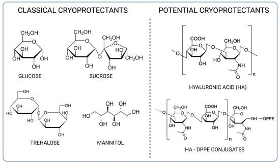 Freeze drying allows drug delivery systems, such as nanoparticles and liposomes, to be obtained and stored as dry forms, thus avoiding chemical and physical instability and improving long-term storage [33,34]. However, several factors can lead to colloidal instability during the freeze-drying process, and many strategies are considered to avoid particle aggregation [7]. Among them, the use of cryoprotectants to embed nanocarriers in an amorphous matrix is one of the most used approaches, and saccharides are largely used to prevent aggregation and facilitate redispersion of the lyophilized powder [6]. Nevertheless, the choice of the saccharide and the conditions of use are crucial for the process, and they differ according to the considered nanosystem. On these bases, the objective of the present study was the preparation of PLGA nanoparticles and liposomes in the presence of various saccharides (monosaccharides, such as mannitol and glucose, disaccharides, such as sucrose and trehalose, and a polysaccharide, HA) to evaluate the cryoprotective effect on the selected nanosystems (Figure 2). Furthermore, concerning HA, it was added to nanoparticles and liposomes in its free form and also as DPPE-conjugates to allow a stronger association with both nanoparticles and liposomes.