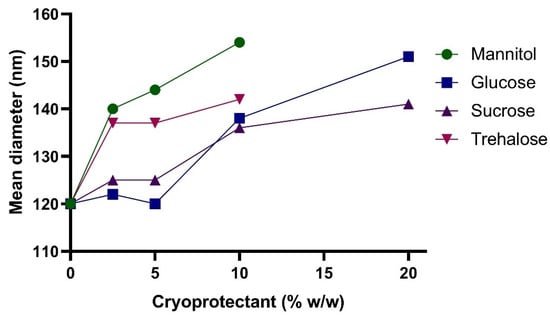 Again, for PEGylated nanoparticles prepared from a blend of PLGA (75:25 or 50:50) and PEG2000-PLGA, the cryoprotectants were added to the formulations after solvent evaporation. Even in this case, the mean hydrodynamic diameter was not affected by the addition of the saccharides, although the particle size was smaller than that of pure PLGA nanoparticles and comprised in the range 85–105 nm, probably due to the amphiphilic nature of PEG2000-PLGA.