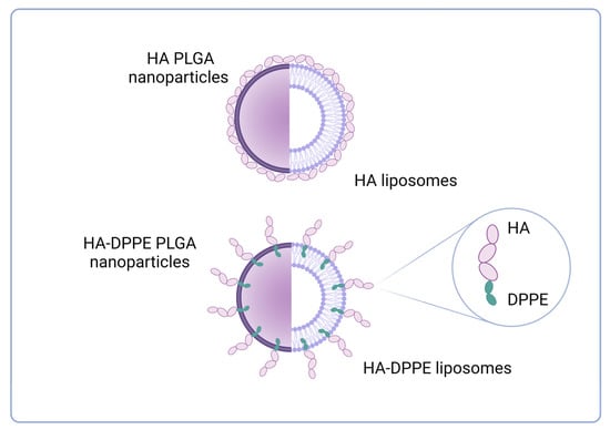 Schematic representation of the association of HA and HA-DPPE conjugates to polymer and lipid nanocarriers (created with BioRender.com).