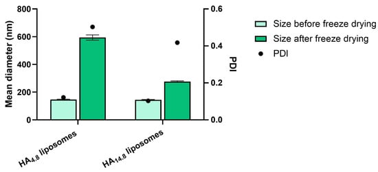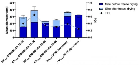 In the further set of experiments, we evaluated the effect of HA as a cryoprotectant agent when it is associated with polymer- and lipid-nanocarrier structure by hydrophobic interactions. Since it is highly hydrophilic, HA (4.8 kDa or 14.8 kDa) was linked to the DPPE phospholipid, which is able to associate with a polymer matrix or phospholipid bilayer and obtain HA-coated nanoparticles. These conjugates have already been used in several settings to prepare HA-decorated liposomes for cell targeting that have been proposed for either intravenous or cutaneous administration [47,48,49,50]. For PLGA nanoparticles, HA-DPPE conjugates were added into the aqueous phase since they are not soluble in acetone, while for liposomes, conjugates were added during the hydration of the lipid film. The potential activity of HA-DPPE conjugates as cryoprotectants during lyophilization was assessed by analyzing the particle size and PDI of PLGA nanoparticles and liposomes before and after freeze drying (Figure 6). All formulations in the presence of HA-DPPE conjugates could be easily redispersed after freeze-drying. In particular, the mean hydrodynamic diameter of PLGA 50:50 nanoparticles was slightly affected (11% size variation using HA4.8-DPPE) by the freeze-drying process, thanks to the presence of HA-DPPE in the formulations. Comparable results were achieved for liposomes, which showed a size variation below 20% (Figure 6). All the resuspended formulations were stable during 4-weeks storage at 4 °C (see Figure S1 for PLGA 50:50 nanoparticles prepared with HA4.8-DPPE or HA14.8-DPPE).