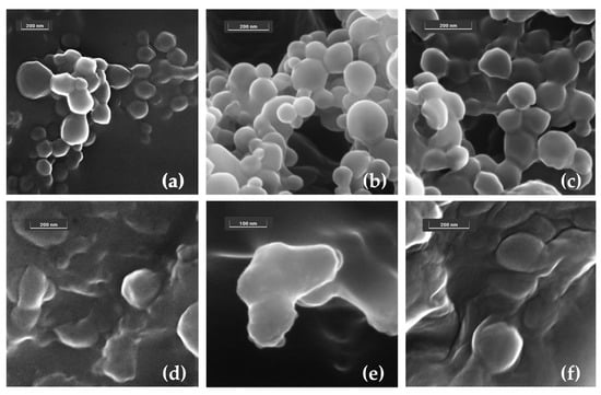 FESEM analyses carried out on HA4.8-DPPE/PLGA 75:25 nanoparticles, and HA4.8-DPPE-liposomes further validated the beneficial effect of HA-DPPE in the formulations (Figure 7). In particular, HA4.8-DPPE-associated nanoparticles and liposomes in their as prepared form appear as embedded in a matrix formed upon drying of the solution. Moreover, HA4.8-DPPE/PLGA 75:25 nanoparticles showed an almost spherical shape (a), whereas HA4.8-DPPE-liposomes displayed a slightly globular shape (d) due to the drying step carried out to prepare the sample for the measurements (Figure 7). The samples were also examined after the freeze-drying process (b,e) as well as after further resuspension (c,f); the results showed that both morphology and size were maintained, which indicates that (i) HA-DPPE-associated lyophilized nanoparticles and liposomes can be redispersed after freeze drying, and (ii) the addition of HA-DPPE effectively enhanced the stability of the nanosystems.