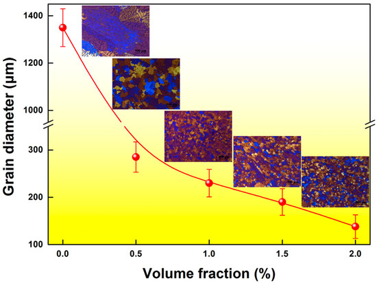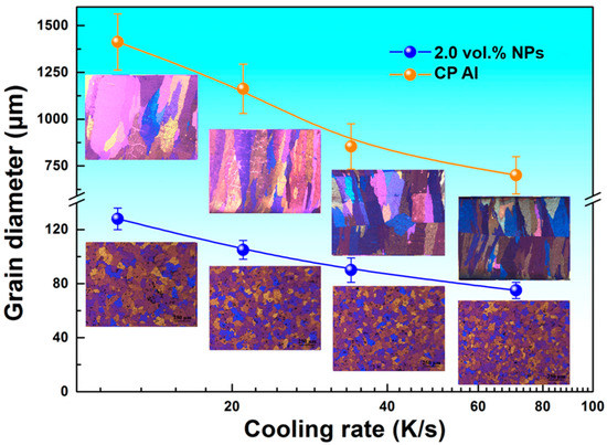 Figure 3 are the variations in grain size with cooling rate. It can be seen that the grains of the CP Al maintain the columnar structure, although an increased cooling rate leads to the finer α-Al grains. With the addition of 2 vol.% NPs, the coarse columnar grains are transformed to refined equiaxed ones, and the enhanced cooling rate leads to the further gain refinement. When the cooling rate reaches 70 K/s, the mean grain size is reduced up to 78 μm.
