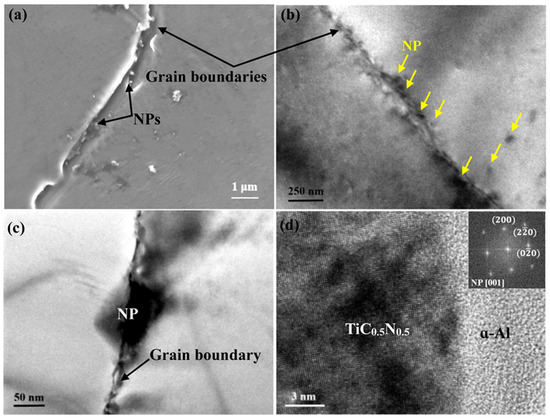 Figure 5b reveals the intragranular distribution of NPs. Instead of accumulating at the growing interface, they are evenly distributed in the Al matrix.