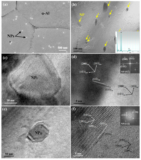 Figure 5e exhibits the other nanoparticle entrapped in the matrix. Likewise, it possesses a coherent interface with the α-Al as shown in