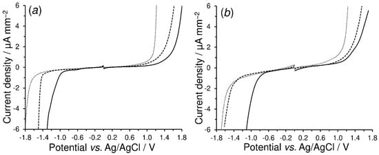 Linear-sweep voltammograms of 0.1 mol L−1 BRB of pH 2 (solid), 7 (dashed), 12 (dotted line) recorded on GCE (a) and EShE (b) at Estep = 2.5 mV and ν = 50 mV s−1.