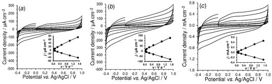 As shown in Figure 3, cyclic voltammetry of pure 0.1 mol L−1 BRB (pH 7) from −0.4 to +1.0 V at a scan rate in the range of 0.05–1.50 V s−1 was used to determine the double-layer capacitance (). The inserted graphs plot the linear dependences of the background current responses at +0.4 V on the applied scan rate for the GCE (a), EShE (b) and BShE (c). The double-layer-capacitance values of the EShE (45.7 μF cm−2) and BShE (192.0 μF cm−2) were found to be significantly higher than those of the commercially available GCE (27.6 μF cm−2). A significant increase in double-layer capacitance in the case of the BShE was probably caused by the low content of conductive carbon (62.3%) and a high proportion of impurities, predominantly SiO2 and FeS2.