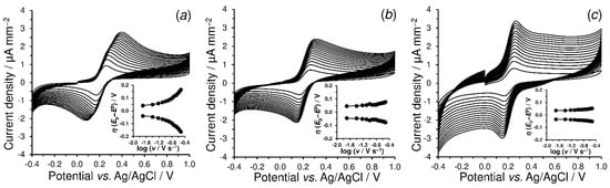 In addition, the charge-transfer coefficient (α) and number of electrons (n) can be calculated from evaluation of peak potentials () using the method described by Laviron [], according to Equations (8) and (9). Laviron’s approach can be used only for cases when the peak separation (ΔE) is higher than 200/n in mV. From a practical point of view, slopes of linear parts of the corresponding trumpet plots are used into calculations. Therefore, knowledge of a standard redox potential () is not needed because it is not used in calculations.