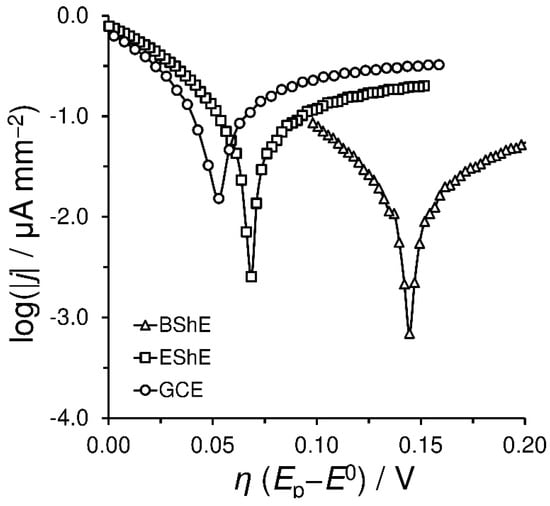 Analysis of the cathodic and anodic polarization Tafel plots obtained at BShE, EShE and GCE for 1 mmol L−1 K4[Fe(CN)6] in 0.1 mol L−1 BRB (pH 7) at a scan rate of 100 mV s−1.